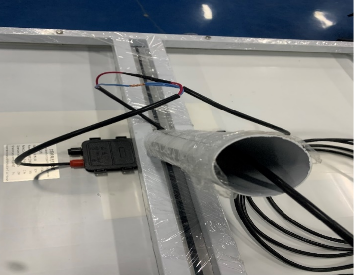 10、電池板接線,注意紅線為正極、黑(藍)線為負極,兩塊電池板并聯接到延長線上
