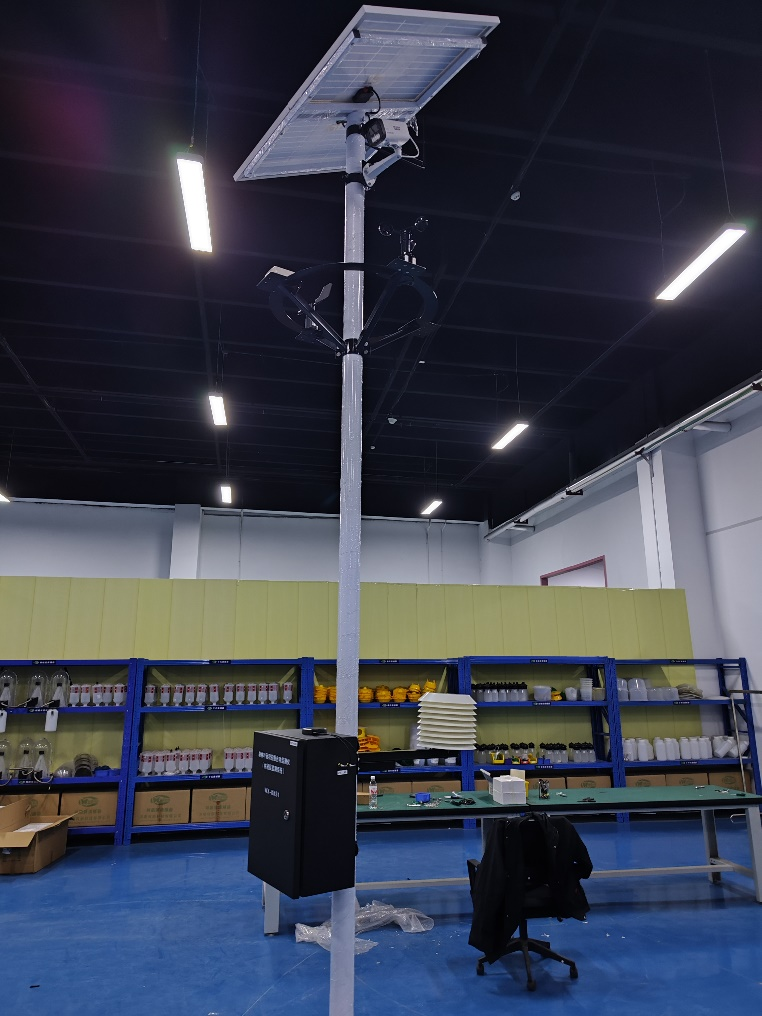 20、設備安裝完成(注:電池線從燈桿底部穿入控制箱;葉面溫濕度傳感器線從控制箱底部穿入控制箱,傳感器固定于樹枝枝干上)